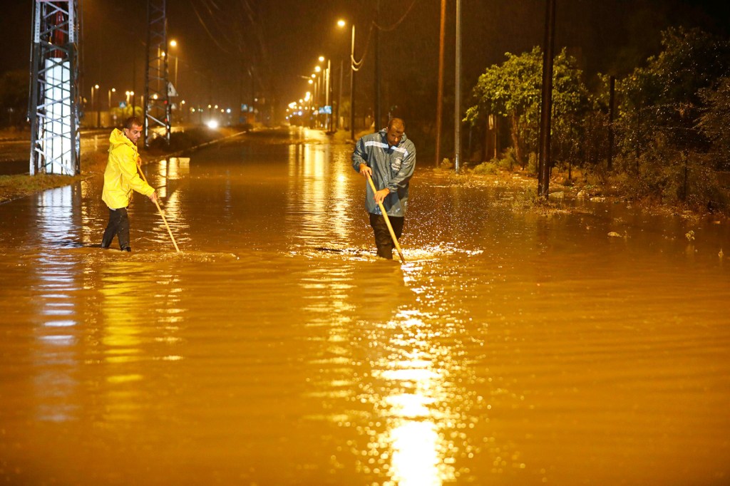 FLOODWATERS People try to open a drain on a flooded street in Derna, Libya, on September 13.