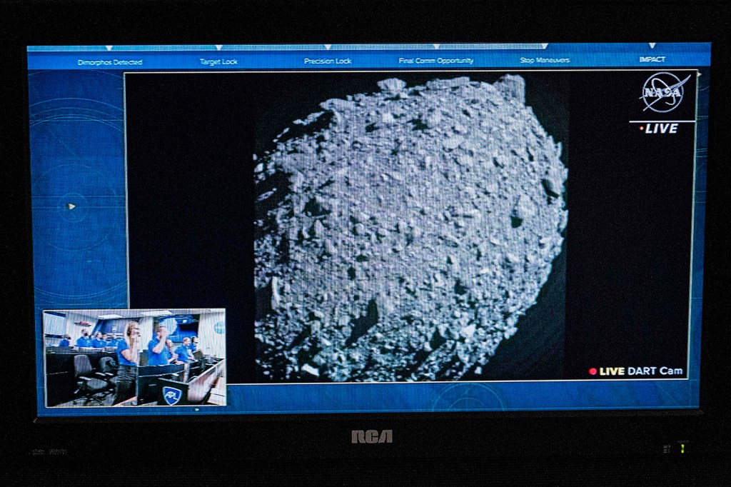 EN CÁMARA Un monitor en el Centro Espacial Kennedy muestra imágenes delDART antes de que la nave se estrelle contra Dimorphos.
