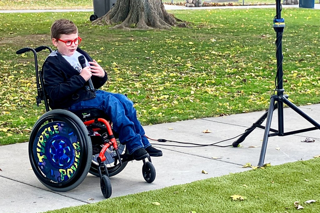 In 2022, Kason and his grandmother went to city council meetings in nearby cities. At each, Kason spoke to local leaders about the need for inclusive playgrounds.