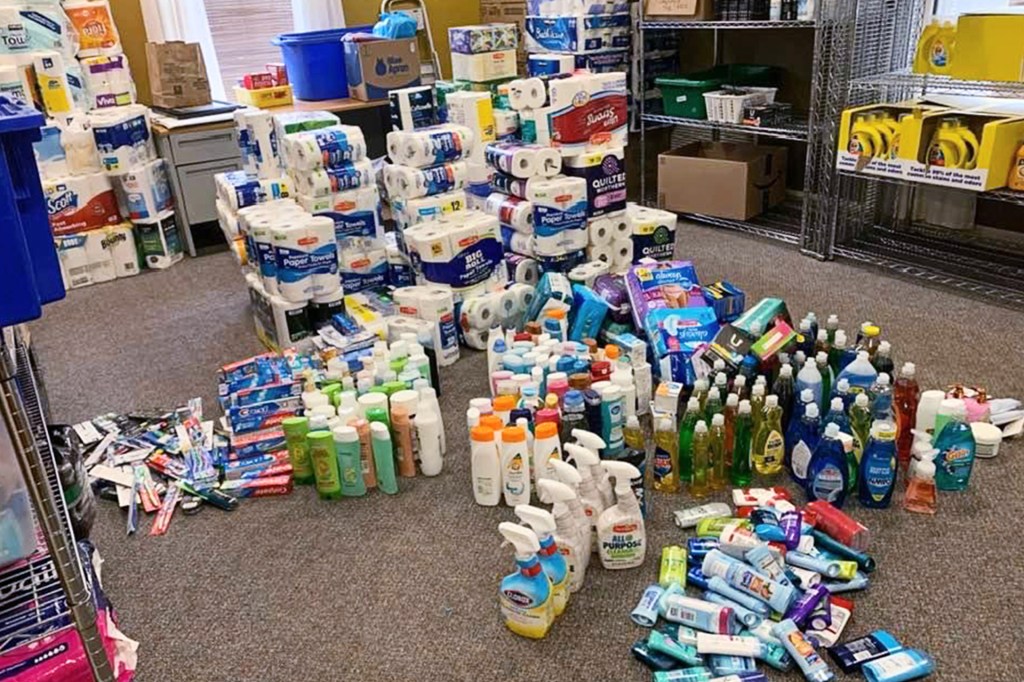 STACK IT UP This haul of hygiene supplies is ready to be donated.