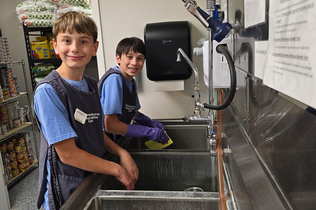 SQUEAKY CLEAN Hayden works alongside another Wagging Tails volunteer. Their tasks include washing pet bowls.