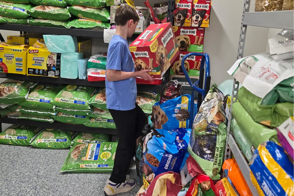 TASTY TREATS Hayden stocks food and treats in the Maclean-Cameron pet food pantry.