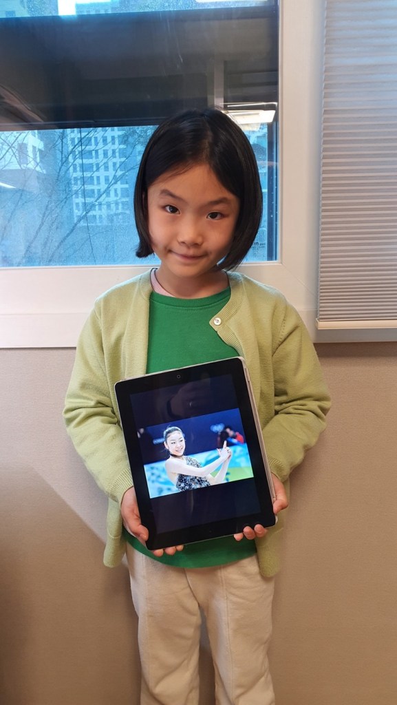 I watched a previous Olympic figure skating competition. Kim Yuna from South Korea won the gold medal in the 2010 Winter Olympics. She was like a dancing flower. She did a triple jump and earned a 78.50 score on short program. In the free skating event, she was like a little flying fairy. She got a score of 150.06 and a gold medal. It was a wonderful competition. I want to be like Kim Yuna! Kate B., 9, South Korea