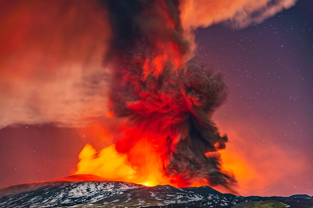 Smoke billows from Mount Etna, in Italy, on February 10. The eruption sparked a rare volcanic storm, sending lightning bolts across the sky. But it did not caus…