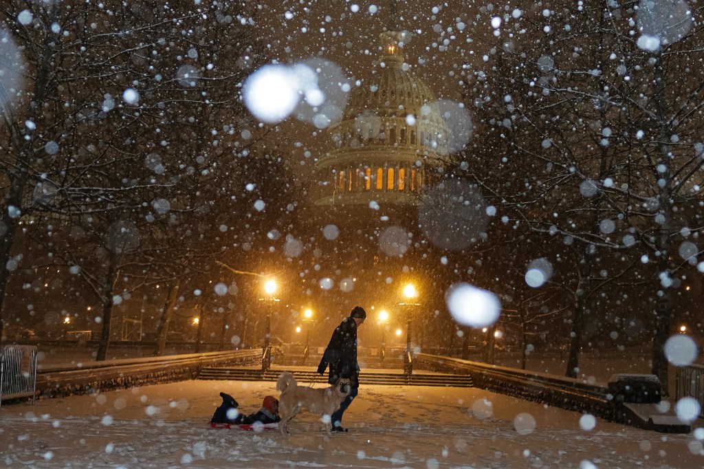 Two people and their dog play in the snow outside the U.S. Capitol, in Washington, D.C., on February 11. Parts of the country have seen heavy snow and record lo…