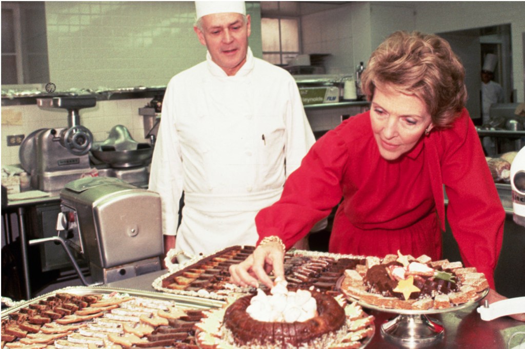 The White House has a chef. The chef cooks for the president’s family and guests. Here, First Lady Nancy Reagan looks over desserts with the White House chef.