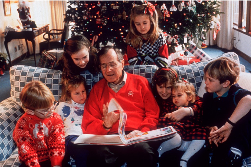 George H.W. Bush is reading to his grandchildren. They are celebrating the holidays at the White House.