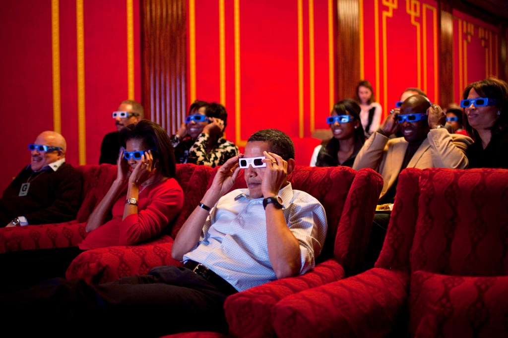 Get out your 3D glasses! The White House has an entertainment room. Here, Barack Obama is watching the Super Bowl.