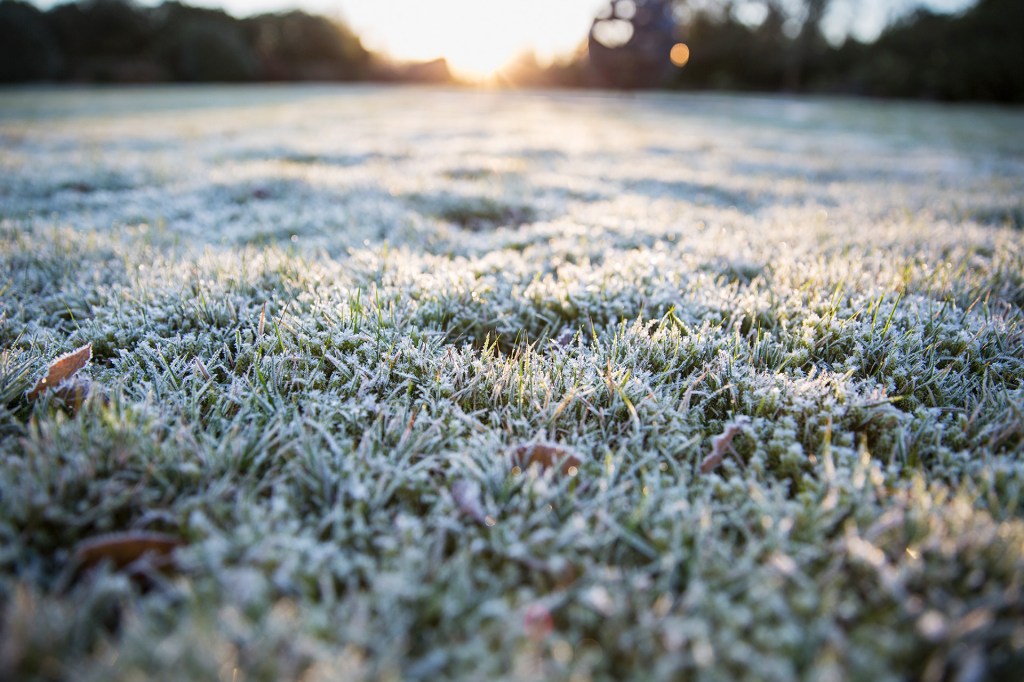 Ice crystals coat the grass. It looks fuzzy. This is called frost. It forms when moisture in the air freezes.