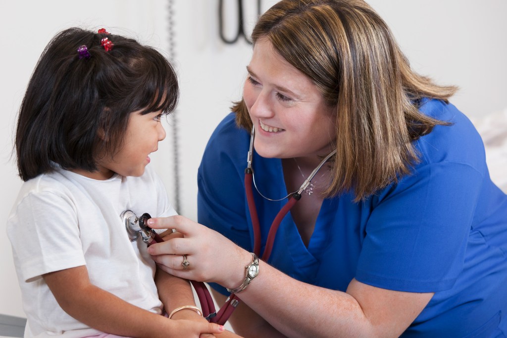 A school nurse helps students who are not feeling well. This nurse is checking a student’s heartbeat.