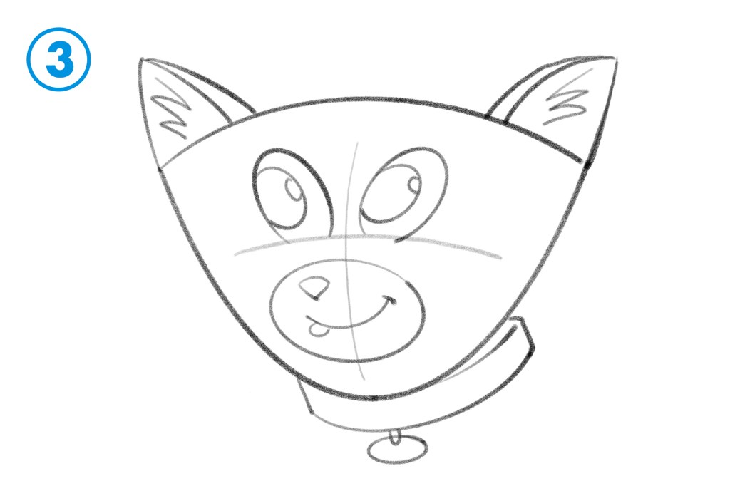 3. Draw more triangles for ears. Add features like a tongue and collar.