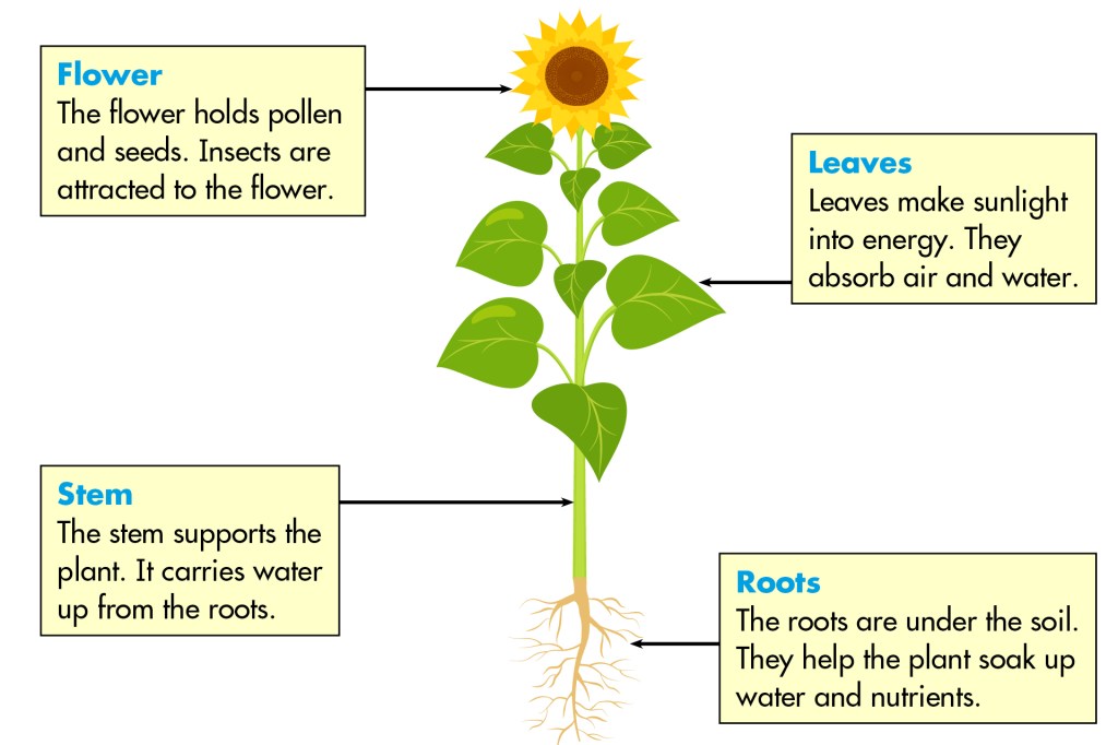 Plants are made up of different parts. Study this sunflower. Learn how each part helps it grow.