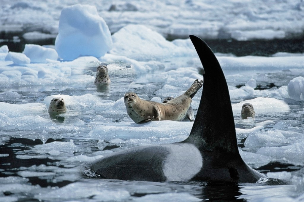 Orcas have different ways of hunting. One is to flap their tail in the water. This knocks seals off the ice.