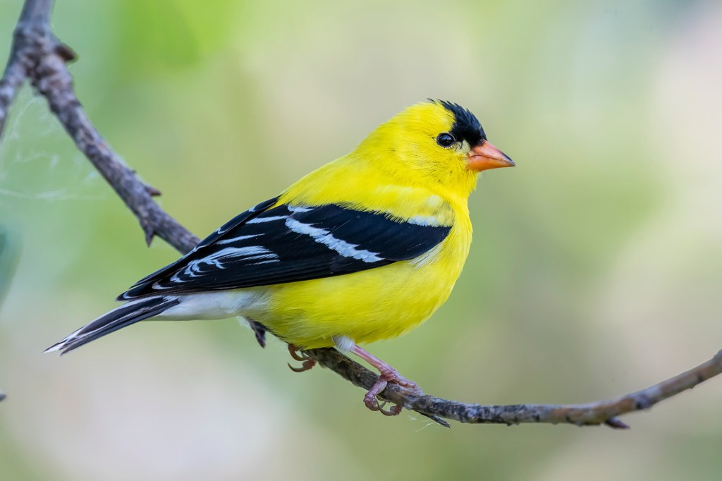 Adults have yellow feathers. The wings are mostly black. These birds seem to bounce as they fly.
