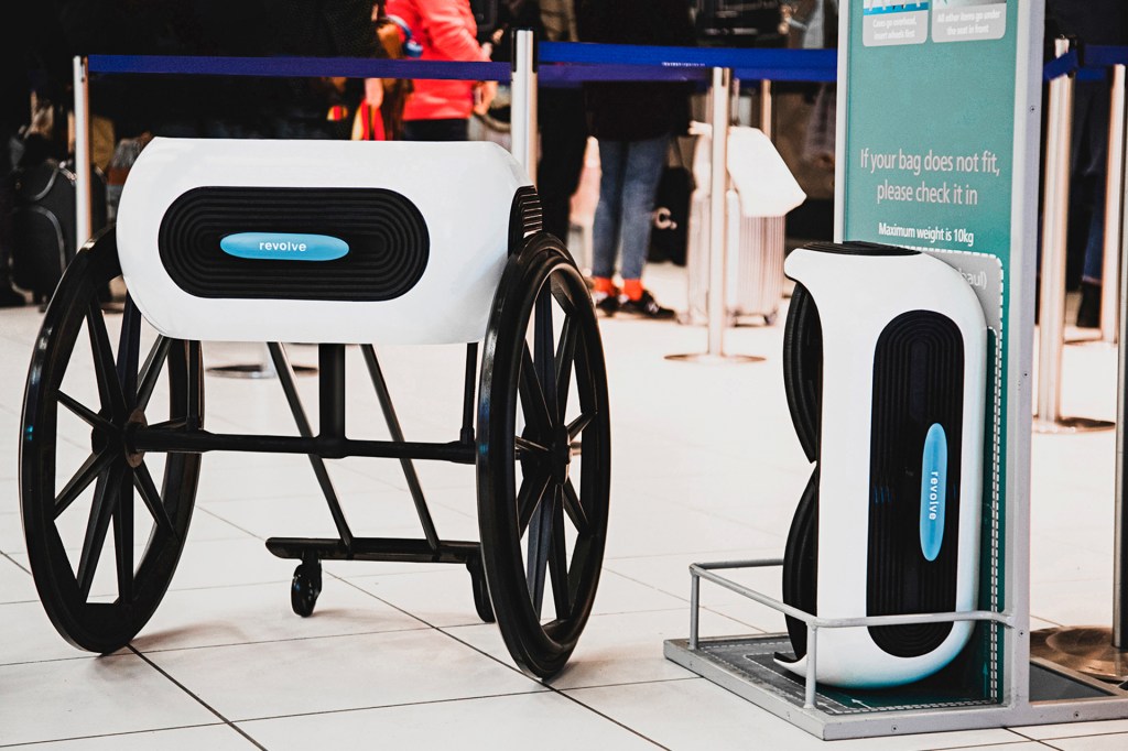The Revolve Air is a wheelchair. Its wheels fold up. This makes it smaller. A smaller wheelchair is better for traveling. It can fit more easily on an airplane.