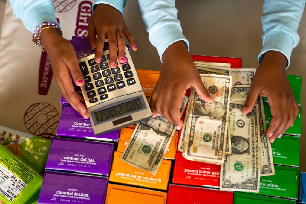 Girl Scouts count the money they make. How will they spend it? Many Girl Scout troops use it to pay for summer camp.
