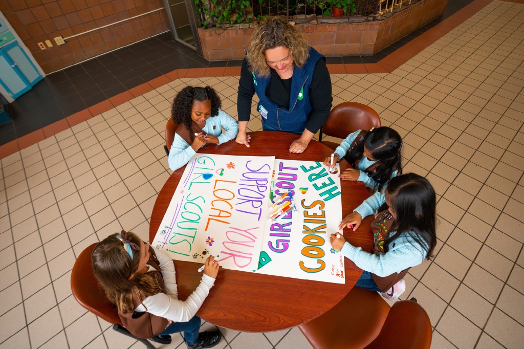 These Girl Scouts are making a poster. It tells people that cookies are for sale.