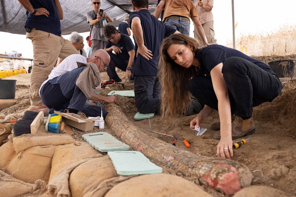 People who study fossils are paleontologists. They dig for fossils. These scientists have found an elephant tusk.