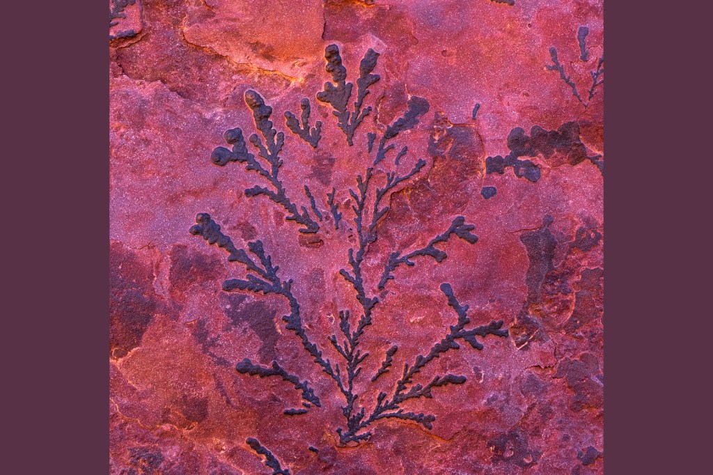 This is a plant fossil. Can you see the plant’s leaves and branches? The plant does not exist anymore. But it left an imprint in the rock. The fossil could be millions of years old.