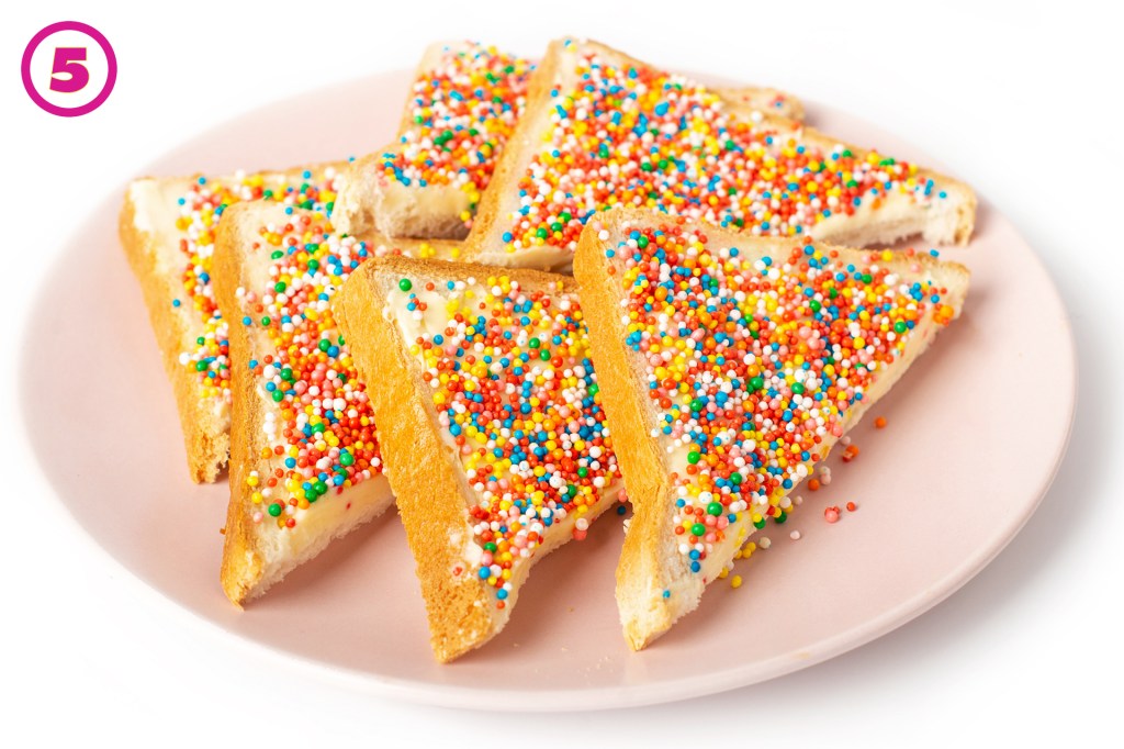 Fairy bread is a treat. It is made from white bread. The bread is covered in butter. It is topped with colorful sprinkles.