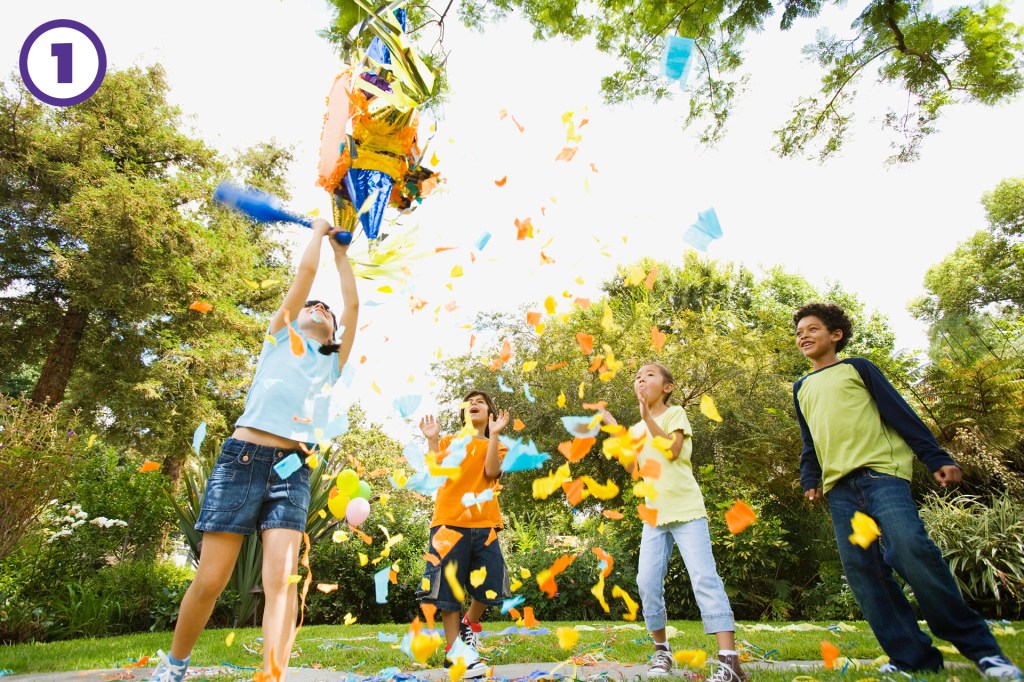 A piñata is filled with candy. Kids take turns hitting it with a stick. The piñata breaks and candy falls out. You grab the candy as fast as you can.