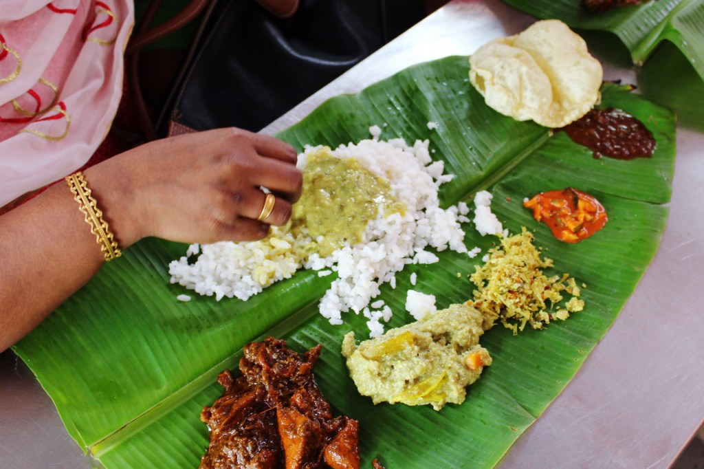In some countries, it is common to scoop food with fingers or bread. This person is eating Indian food by hand.