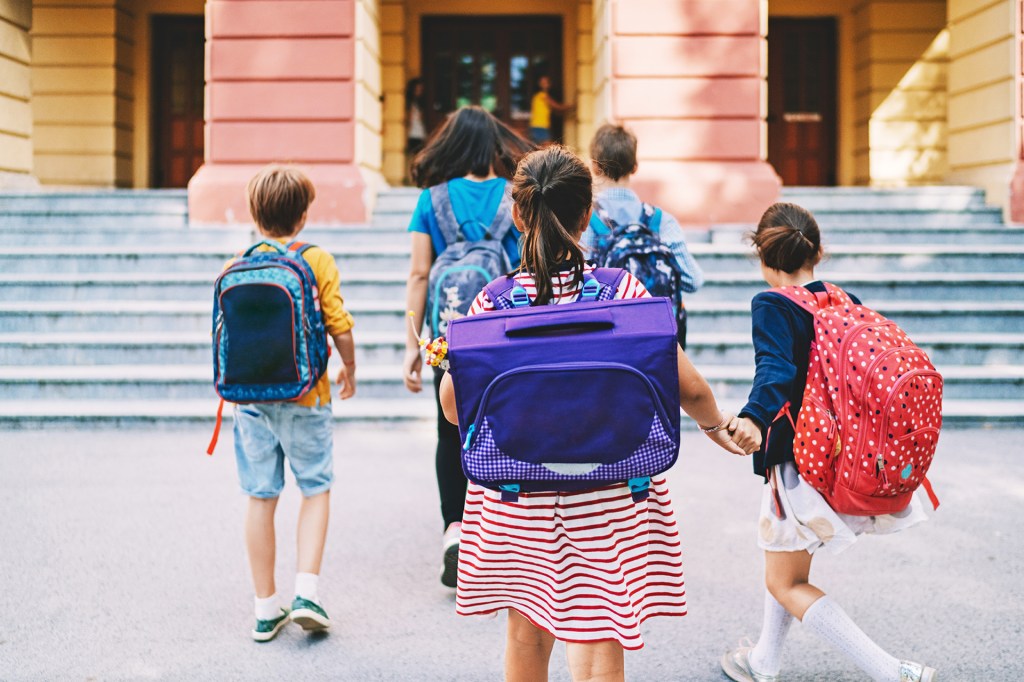 Schools are where kids go to learn. Big cities have many schools. Smaller towns might have just one.
