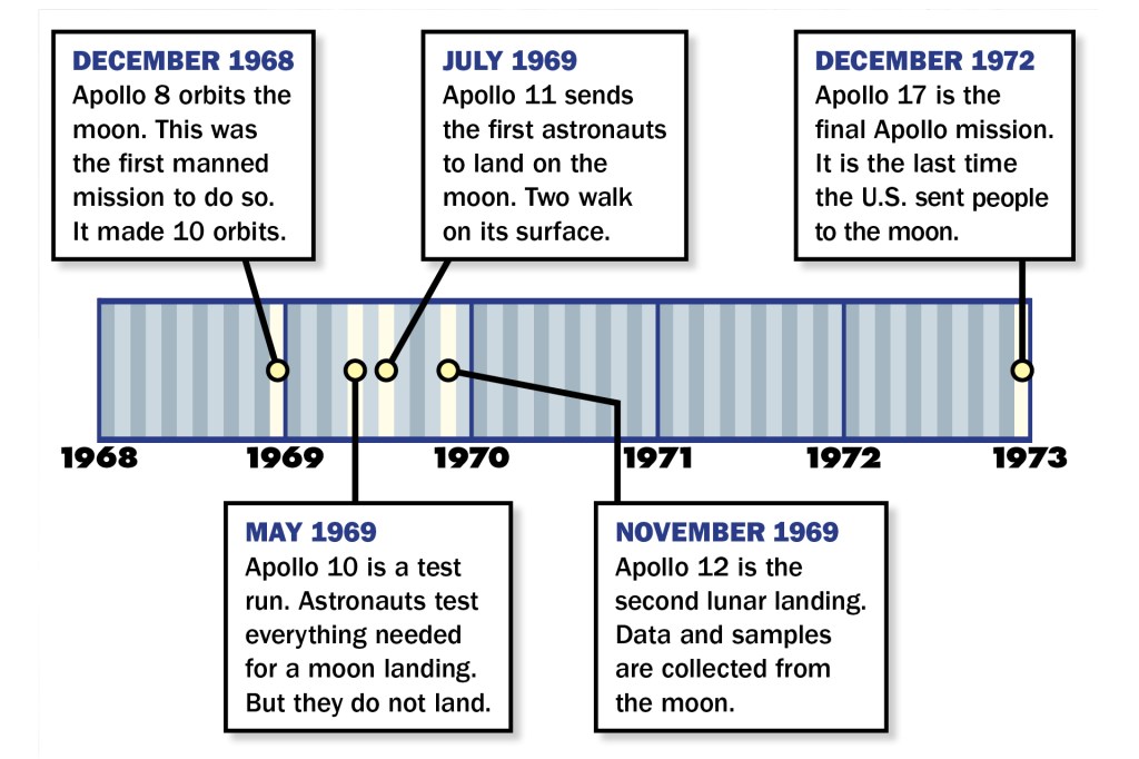 In 1969, people landed on the moon for the first time. The mission was part of the Apollo program. It was run by NASA. That is the United States space agency. There were many Apollo missions. Here are five of them. Would you like to explore the moon?