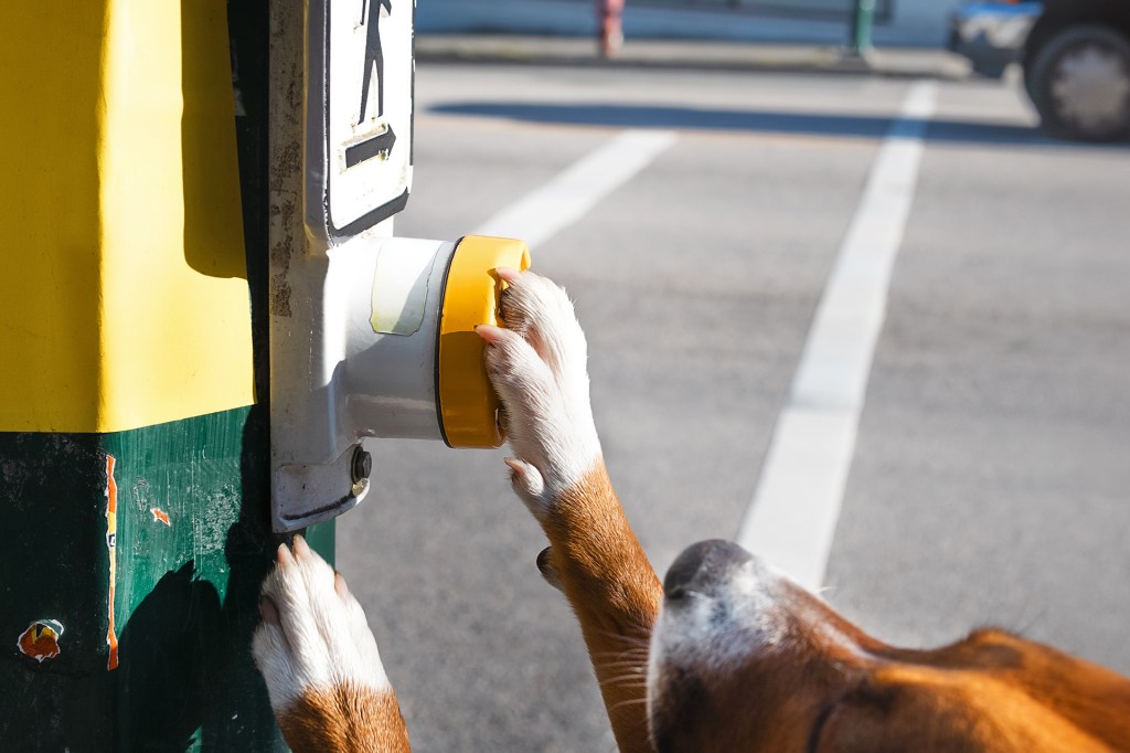 Guide dogs keep an eye on traffic. Some can even push crosswalk buttons. These dogs help people get around.