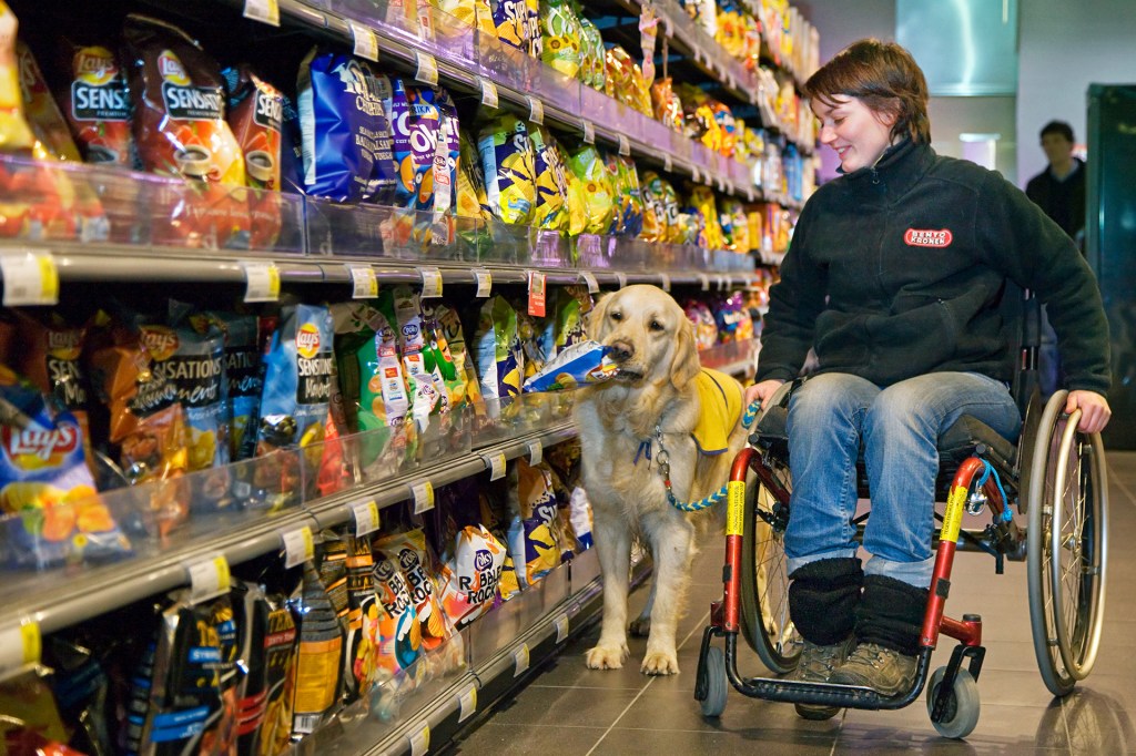 Not all service dogs guide people. Some do other tasks. They grab items. They pull wheelchairs.