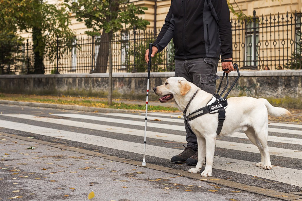 Guide dogs help people who cannot see well. They keep their owners safe. This dog helps its owner. They are a team.