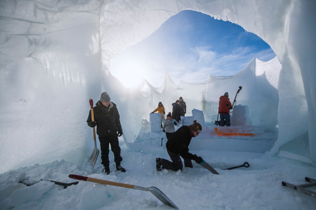 These people are building a concert space. They build it with snow and ice. It is for the Ice Music Festival Norway. Almost everything there is made of ice.