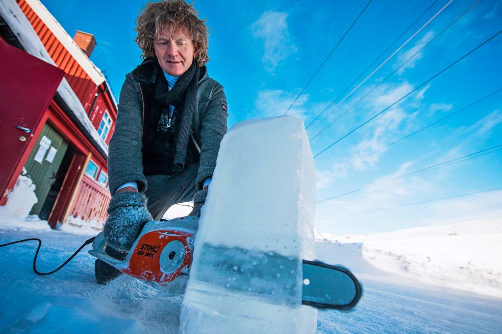 This is Terje Isungset. He is cutting ice with a saw. He will carve