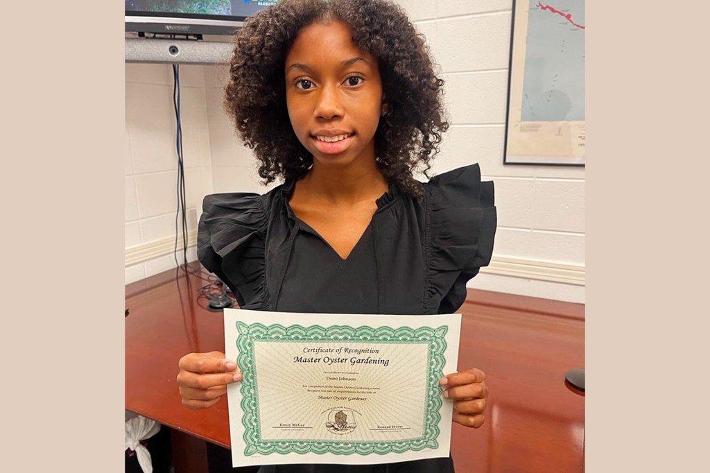 Raising oysters is called oyster gardening. Demi took a class. She became a master gardener. Here, she shows her certificate.