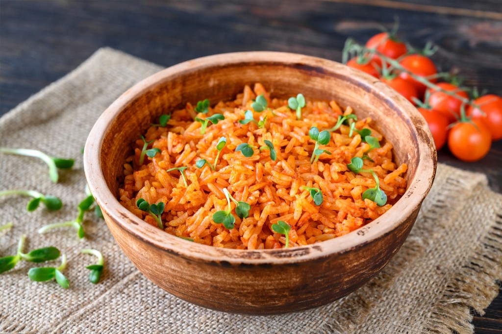 Arroz rojo means “red rice” in Spanish. Tomato sauce gives the rice its color. Arroz rojo is common as a side dish.