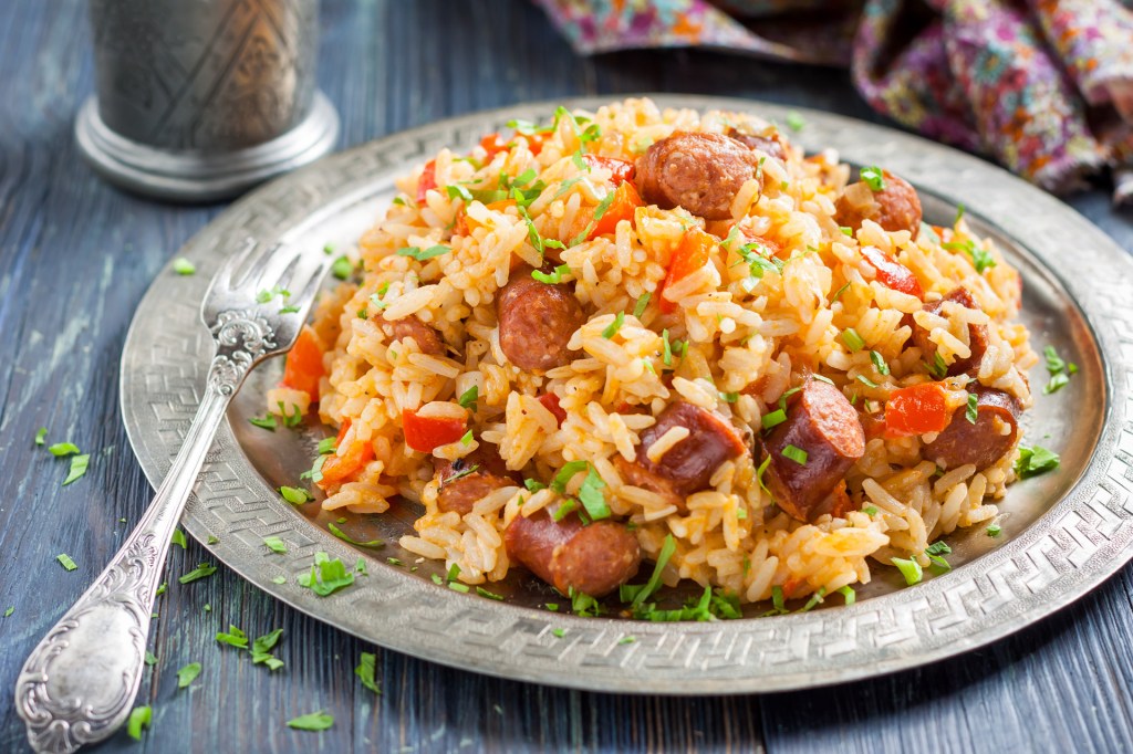 Jambalaya is popular in Louisiana. Rice is cooked with different kinds of meat, seafood, and spices.