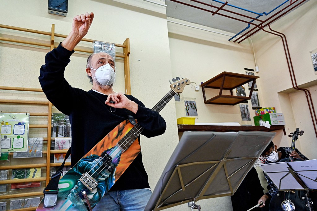 Check out this bass guitar. It has four strings. The body is made of an old skateboard. Victor Gil plays this guitar. He leads the Music of Recycling orchestra.