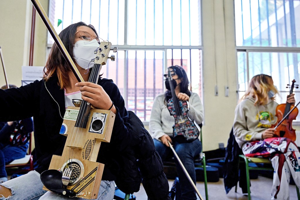 Music of Recycling is an orchestra in Spain. Young people play instruments made from repurposed materials. Here are three of the instruments.