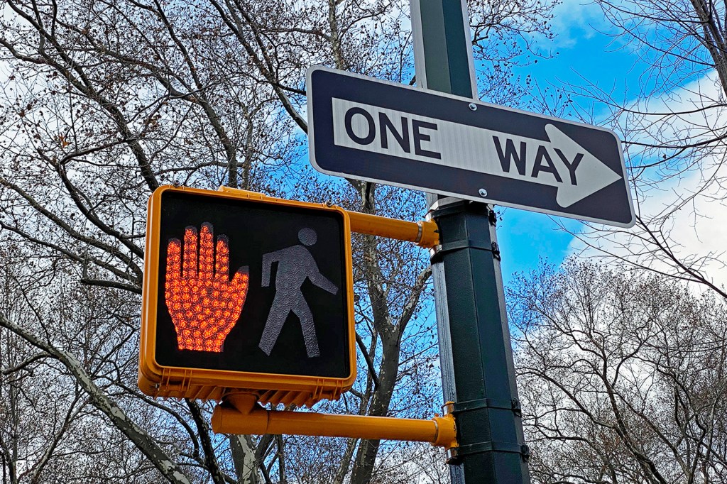 2. Stop. Look for the lighted sign. An orange hand means wait.
