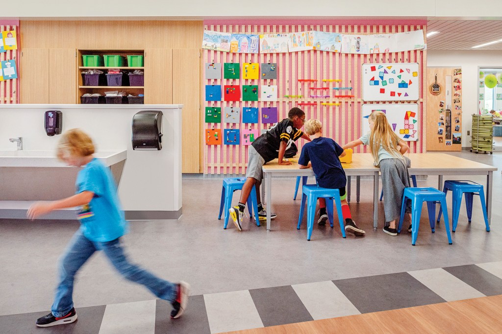 It has lots of natural light. Kids eat lunch in a cheerful space. Some classrooms open to the outdoors.