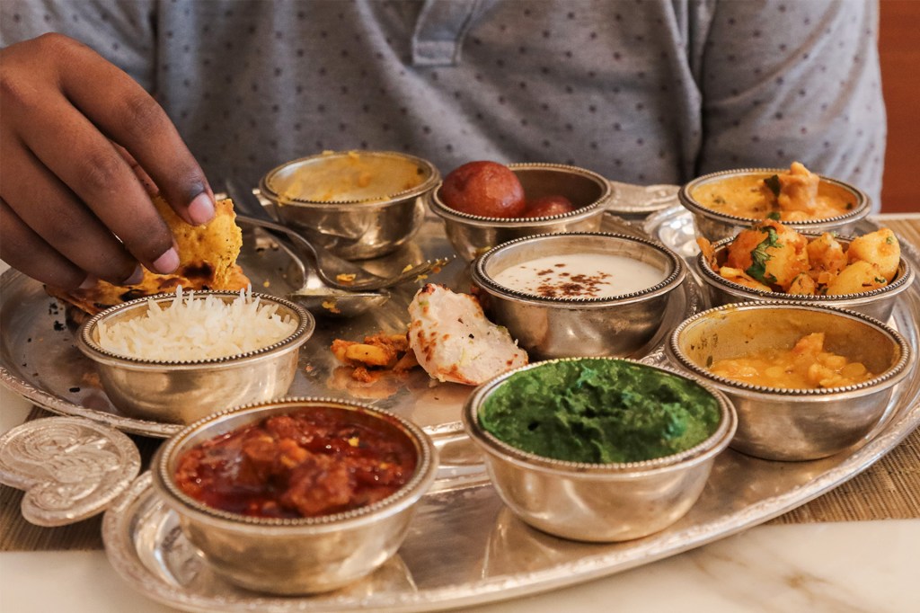 Hands and fingers are used to eat with too. In some countries, food is scooped with fingers or bread. This person is eating an Indian meal. It is called a thali.
