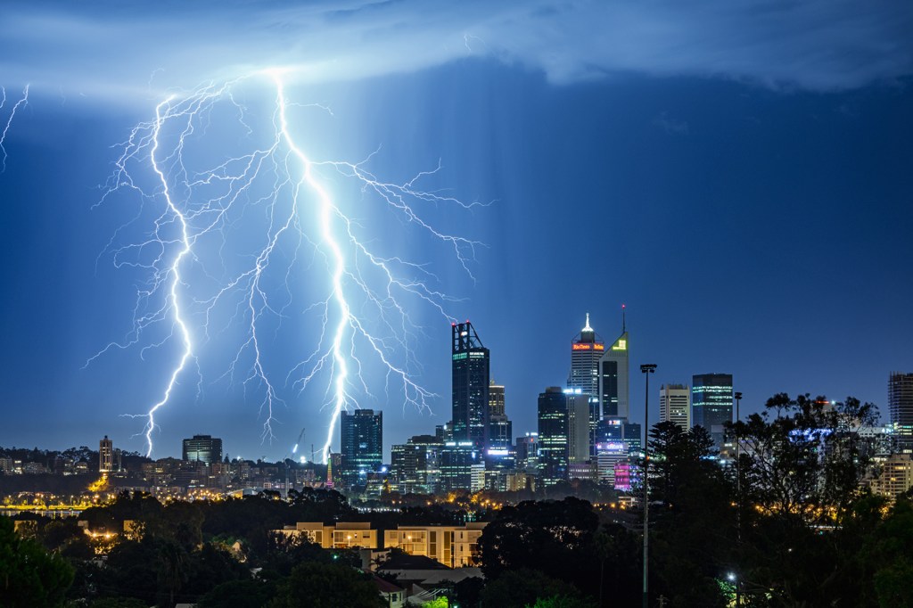During a thunderstorm, the sky is dark. Lightning flashes. Thunder cracks. Boom! Heavy rain falls.