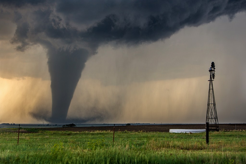 A tornado is a spinning funnel of wind. It spins very fast. It stretches from a cloud to the ground. It can cause a lot of damage.
