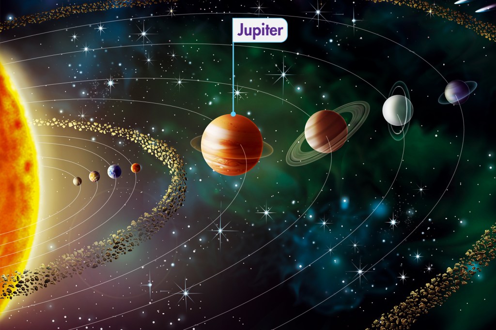 Jupiter is the biggest planet in our solar system. We can see it without a telescope. Jupiter is made of gas. It might not have any solid surface.