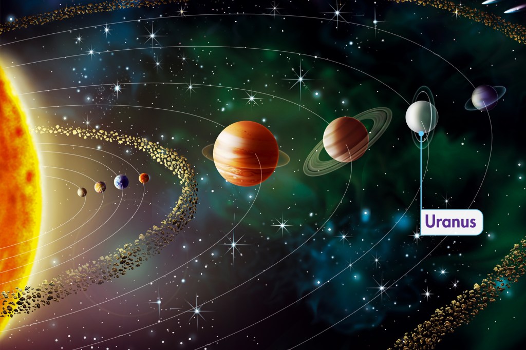 Uranus is very cold. It is the only planet that spins on its side. Uranus is an ice giant. It has a solid, icy core. Methane gas makes it blue.