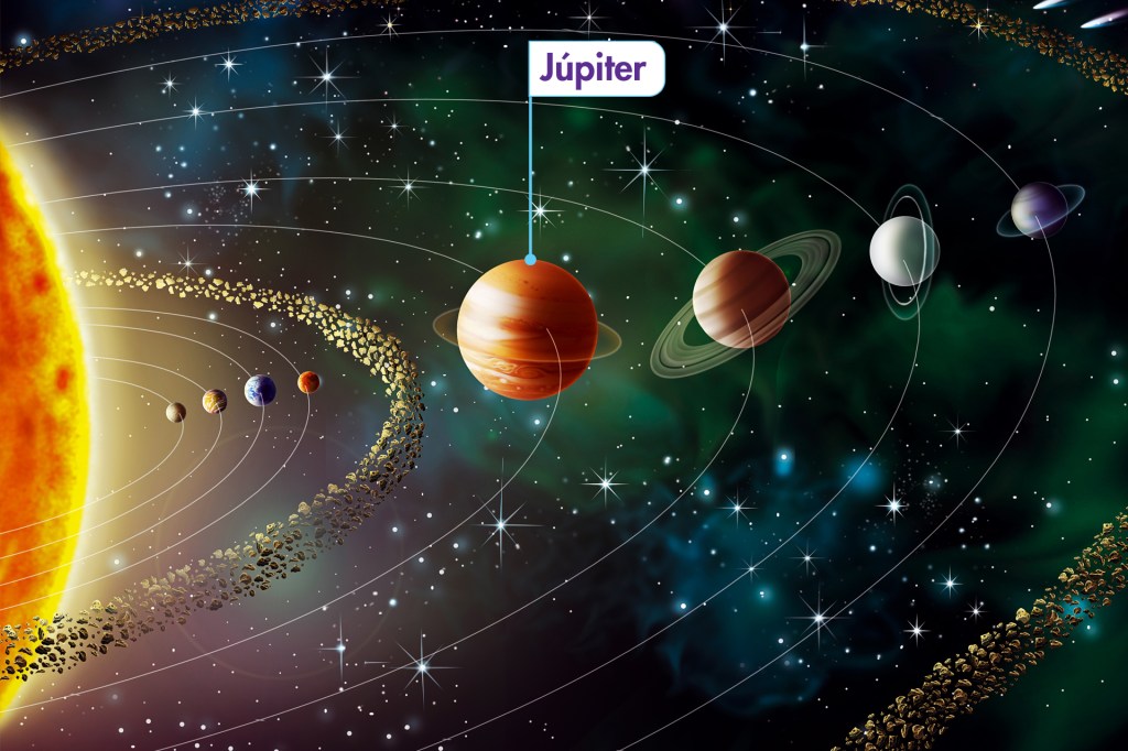 Júpiter es el planeta más grande de nuestro sistema solar. Podemos verlo sin telescopio. Júpiter está compuesto de gas. Es posible que no tenga ninguna superficie sólida.