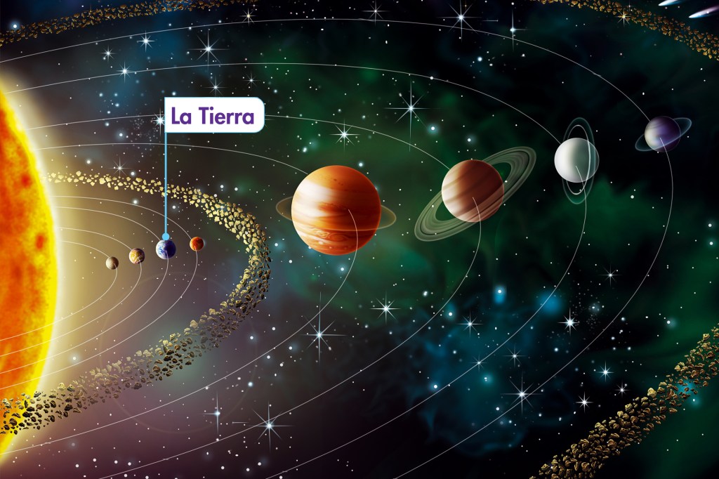 La Tierra es nuestro hogar. Es el tercer planeta desde el Sol. Es el único que se sabe que tiene seres vivos. La mayor parte de la Tierra está cubierta por agua.