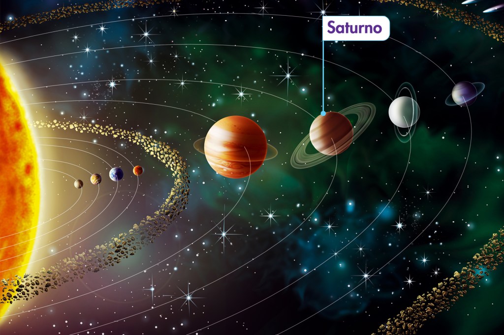 Saturno está rodeado de grandes anillos. Los anillos están compuestos de hielo y roca. Al igual que Júpiter, el planeta está compuesto principalmente de gas.