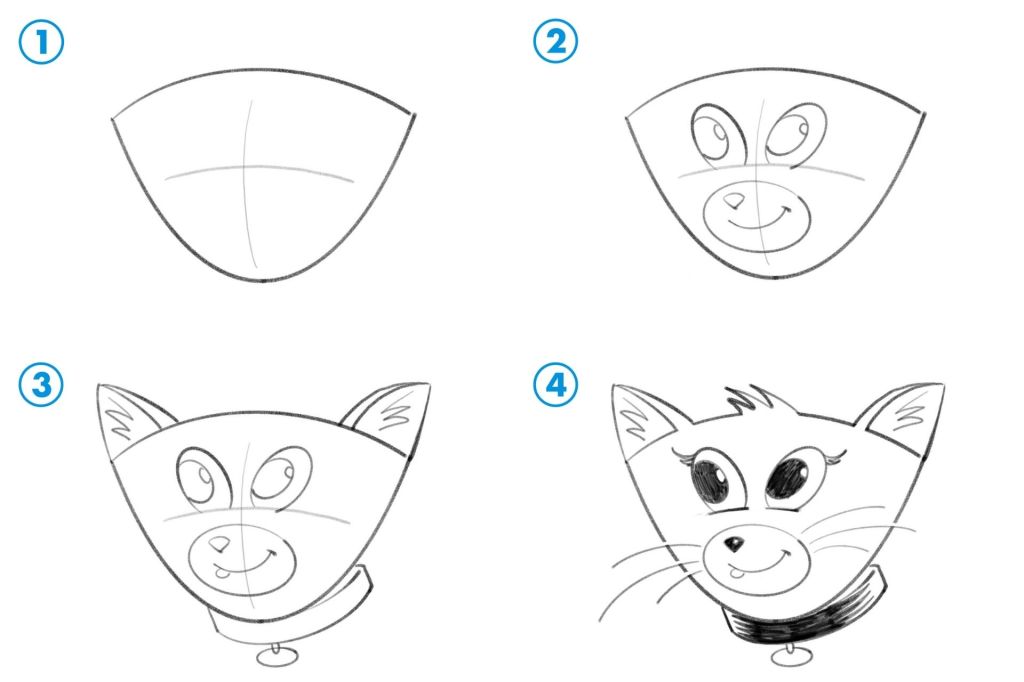 Grab a pencil and paper. Then follow the steps to draw a cat. 1. Start with a U shape. Connect the top. Add lines inside to guide you. 2. Make some ovals for the eyes and mouth. Add a triangle…