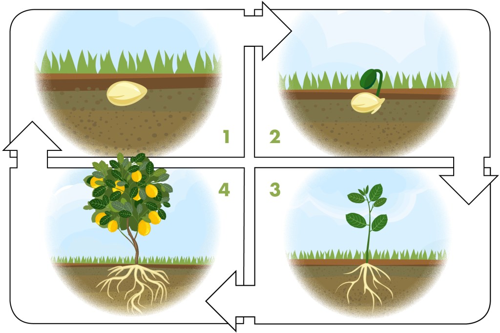 Plants grow in stages. Follow the arrows to learn about their life cycle. 1. A seed is planted. A seed needs soil to grow in. It needs water and sunlight, too. 2. The seed sprouts. The shell of a seed…